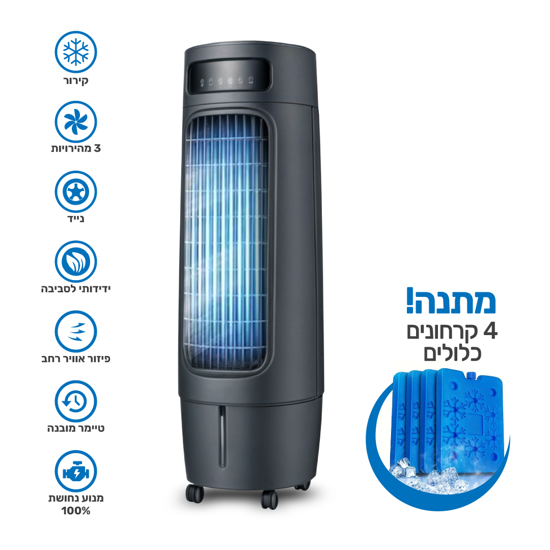 - 3 מהירויות וטיימר עד 12 שעות: מצנן האוויר מגיע עם שלוש מהירויות לבחירה (מהיר, בינוני, נמוך) ומצב טיימר המאפשר הגדרה של עד 12 שעות קירור רציף