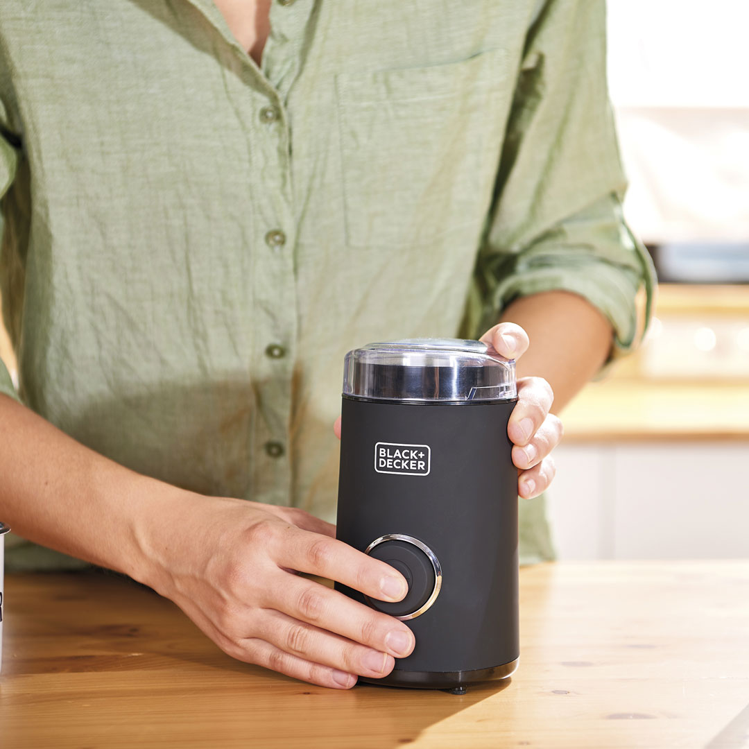 - מטחנת קפה מבית BLACK & DECKER עם מנוע עוצמתי 150W בעל גימור גומי שחור מט עם מגע רך ונוח