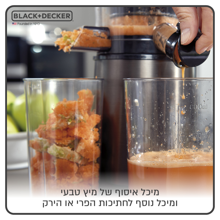 - המוצר עובד עם בורג פנימי חזק במיוחד שלא מרסק את הפרי או הירק אלא מוציא ממנו רק את המיץ הטבעי ישירות אל מיכל איסוף ואת הפסולת למיכל נפרד ובכך משמר את כל הוויטמינים