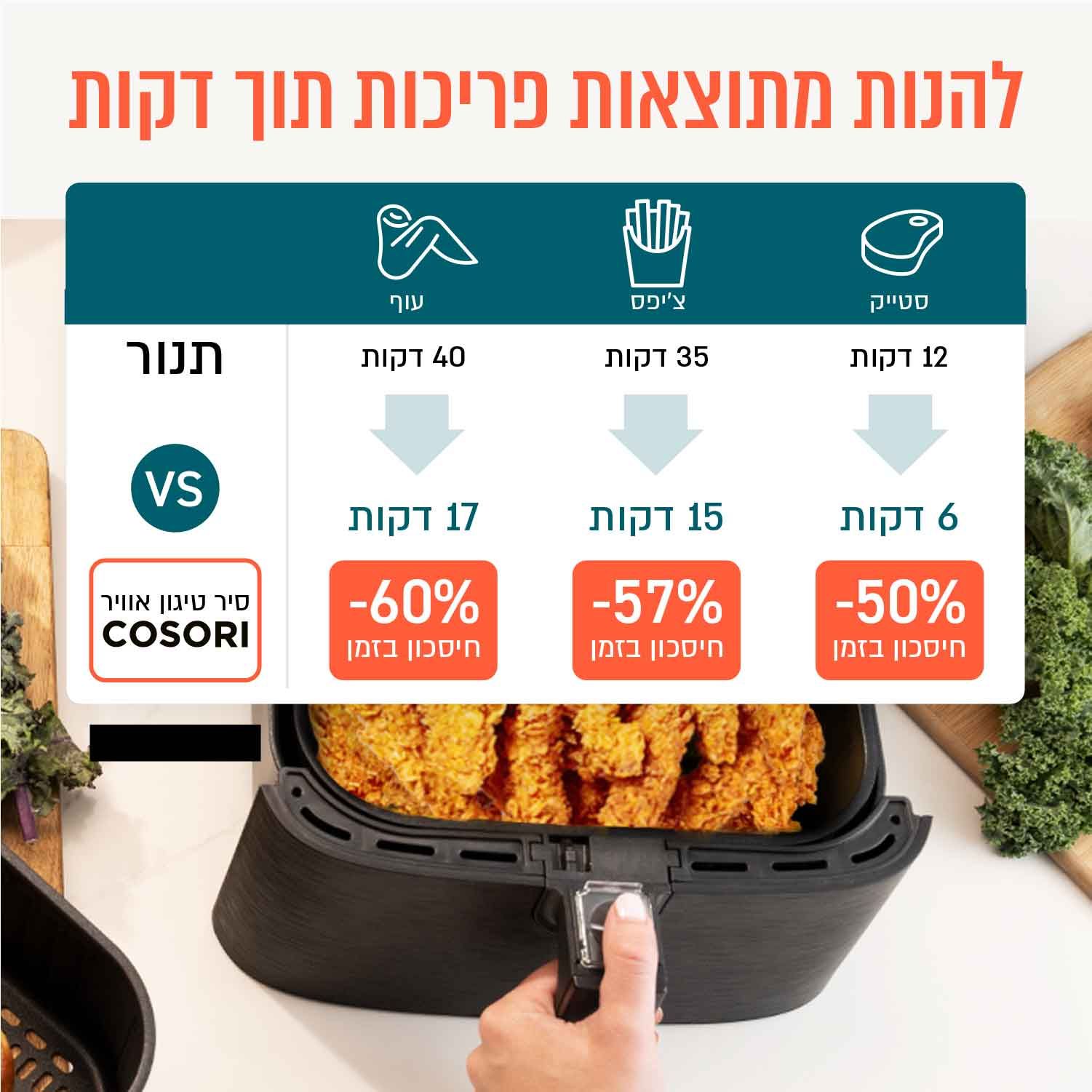 - מתכונים כלולים: מצא השראה לכל ארוחה עם 100 מתכונים מקוריים של COSORI שפים הכוללים גודל, זמן בישול וטמפרטורה. אפילו שפים מתחילים יכולים לבשל בביטחון בריא ויעיל : לבשל את האוכל שלך עד 50% מהר יותר מאשר תנור מסורתי והפחיתו את תכולת שמן המזון שלכם בעד ל-85% מטיגון עמוק מסורתי, נותן לו את אותו טעם פריך ללא חסרונות בריאותיים