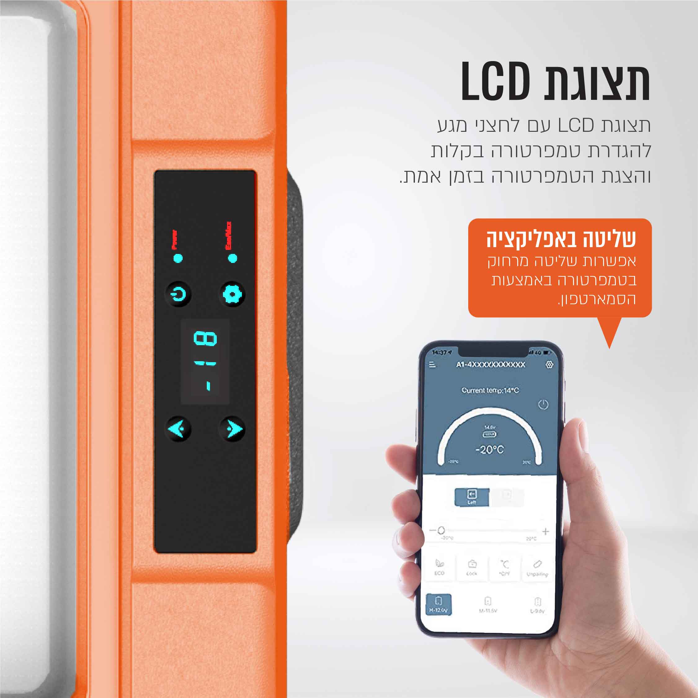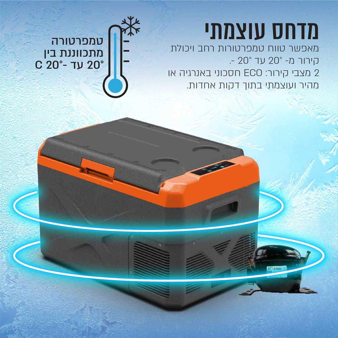 • קיבולת – תא 30 ליטר גדול במיוחד נותן מענה לכל הצרכים בשטח משקאות,בשר, פירות, קרח ועוד מדחס עוצמתי – מאפשר טווח טמפרטורות רחב ויכולת קירור מ- 20° עד 20° – מערכת הגנה חכמה – מונעת עומס יתר של אספקת חשמל מהרכב ומונעת ממצבר הרכב להתרוקן. כך שלא תצטרכו לדאוג להתרוקנות המצבר בעת השימוש שליטה באפליקציה – אפשרות שליטה בטמפרטורה באמצעות הסמארטפון מרחוק מבלי להיות צמודים אליו