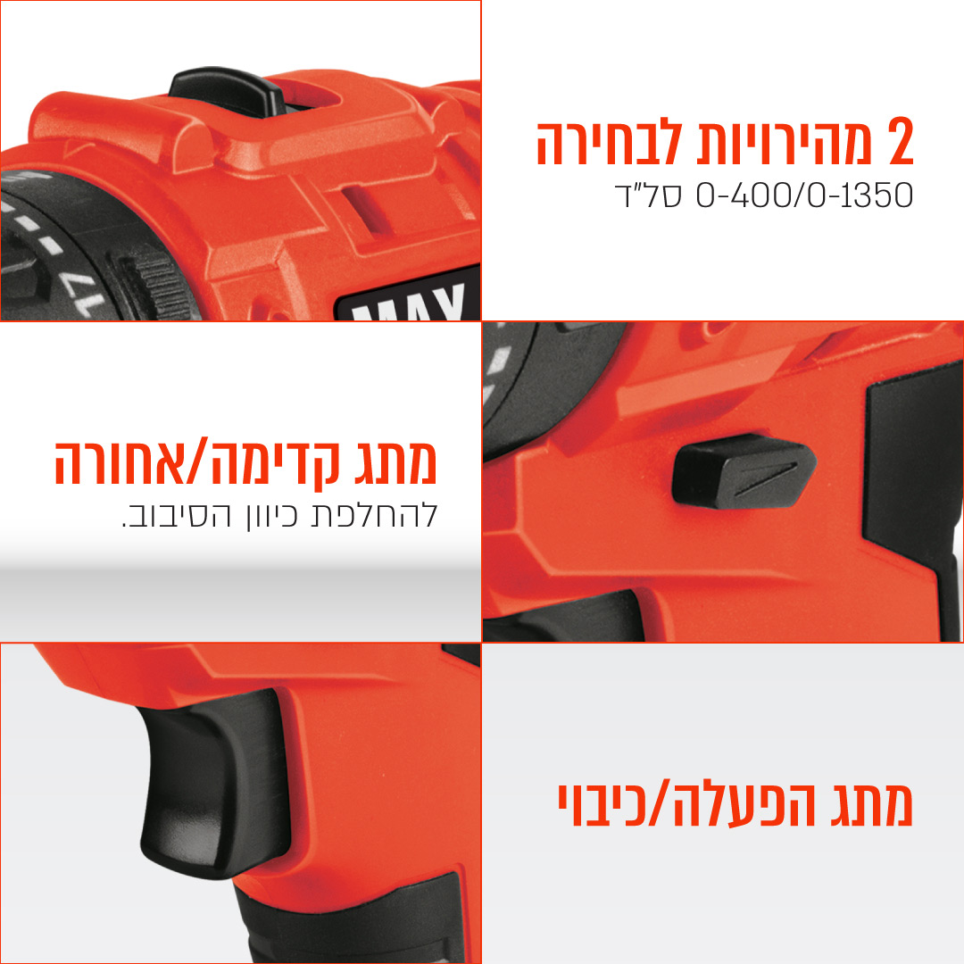 - שני מצבי מהירות מכניים: מהירות ללא עומס של 0-400 / 0-1500 סל"ד להתאמה מושלמת בין עבודות הברגה וקדיחה