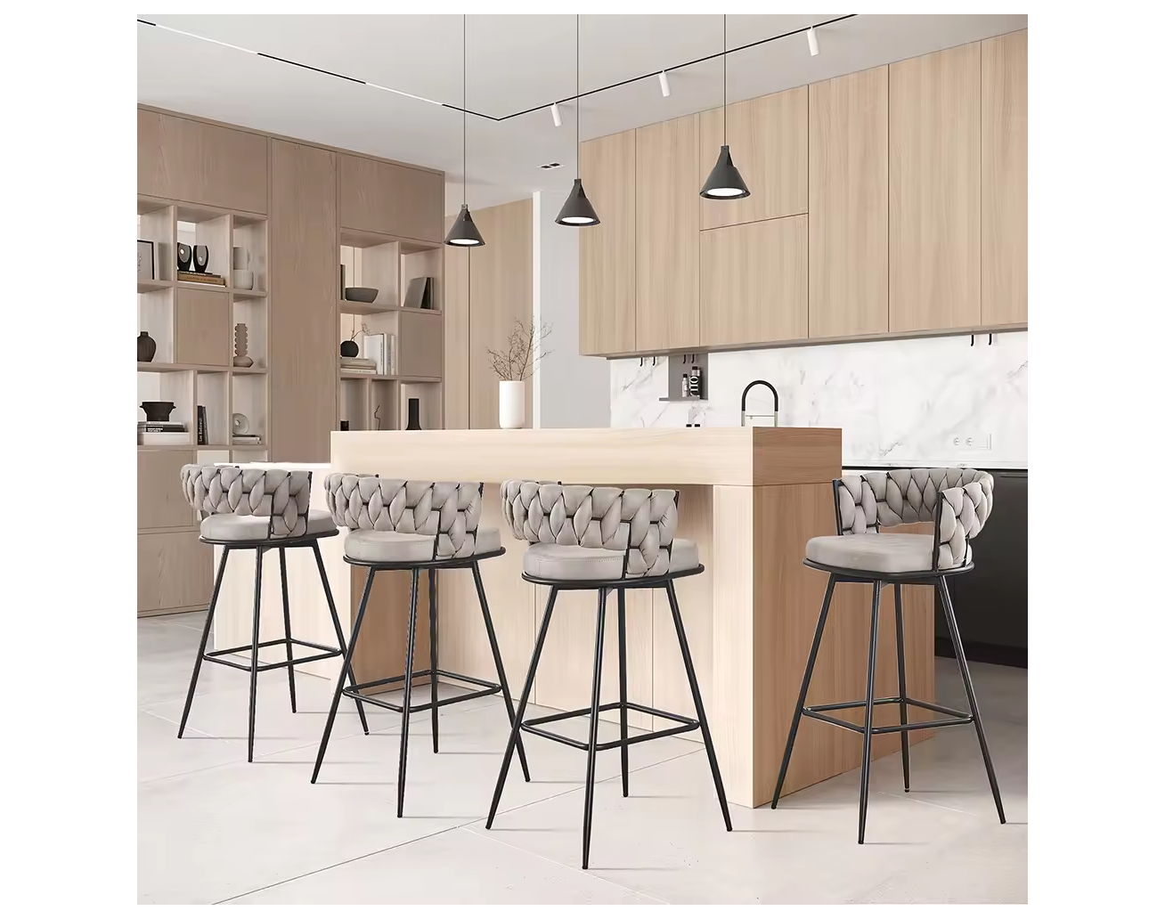 - 4 כיסאות בר בגובה 77 ס"מ עם מושב בד זמש, עיצוב ייחודי של גב ארוג ורגלי מתכת יציבות