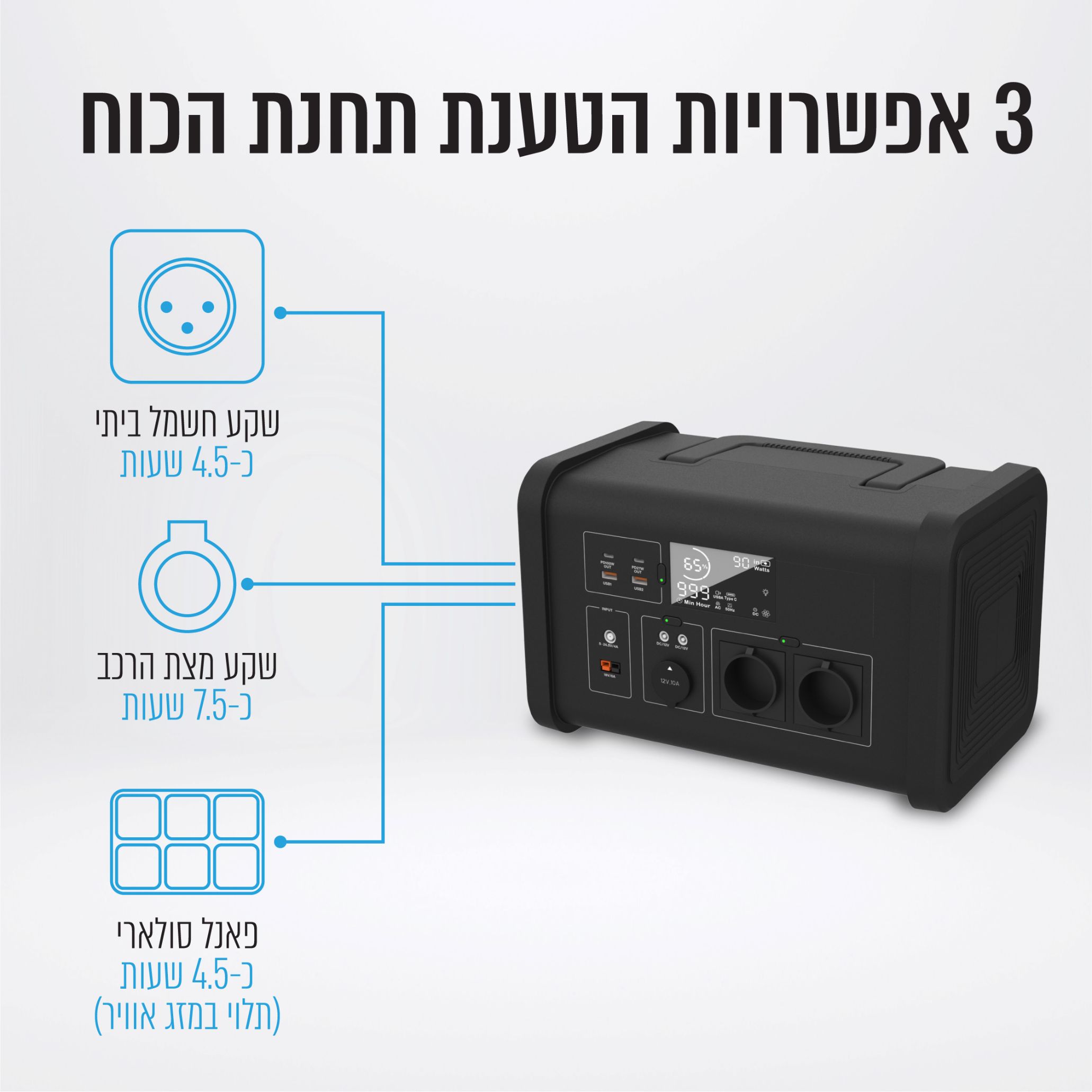 - הטענת תחנת כח: מטען רכב (60 וואט) כ-7.5 שעות, חשמל ביתי (98 וואט) כ-4.5 שעות, פאנל סולרי (100 וואט) כ-4.5 שעות (תלוי במזג אוויר)