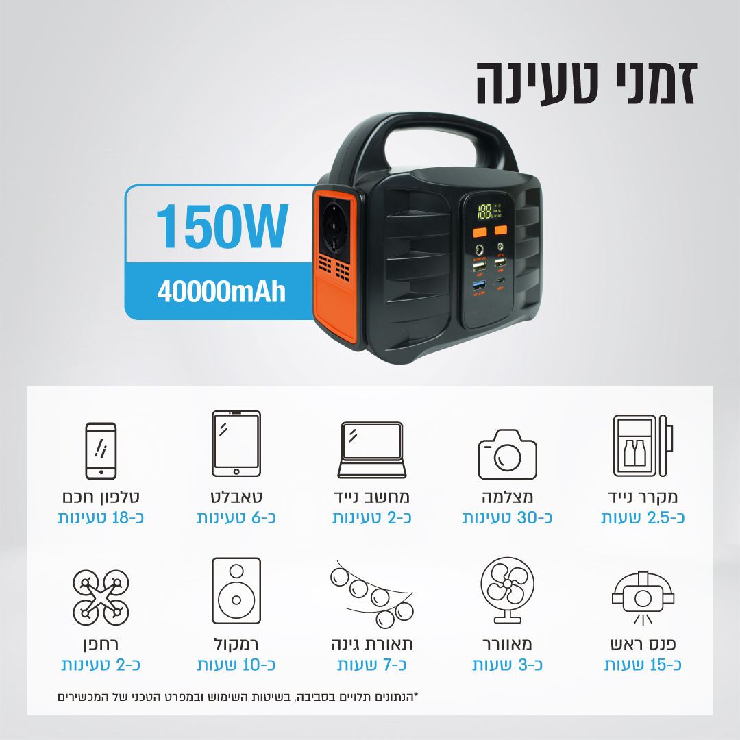 - סוללה חזקה – קיבולת של 40,000 מיליאמפר להטענה / הפעלה מגוון רחב של מוצרי חשמל עד 150W