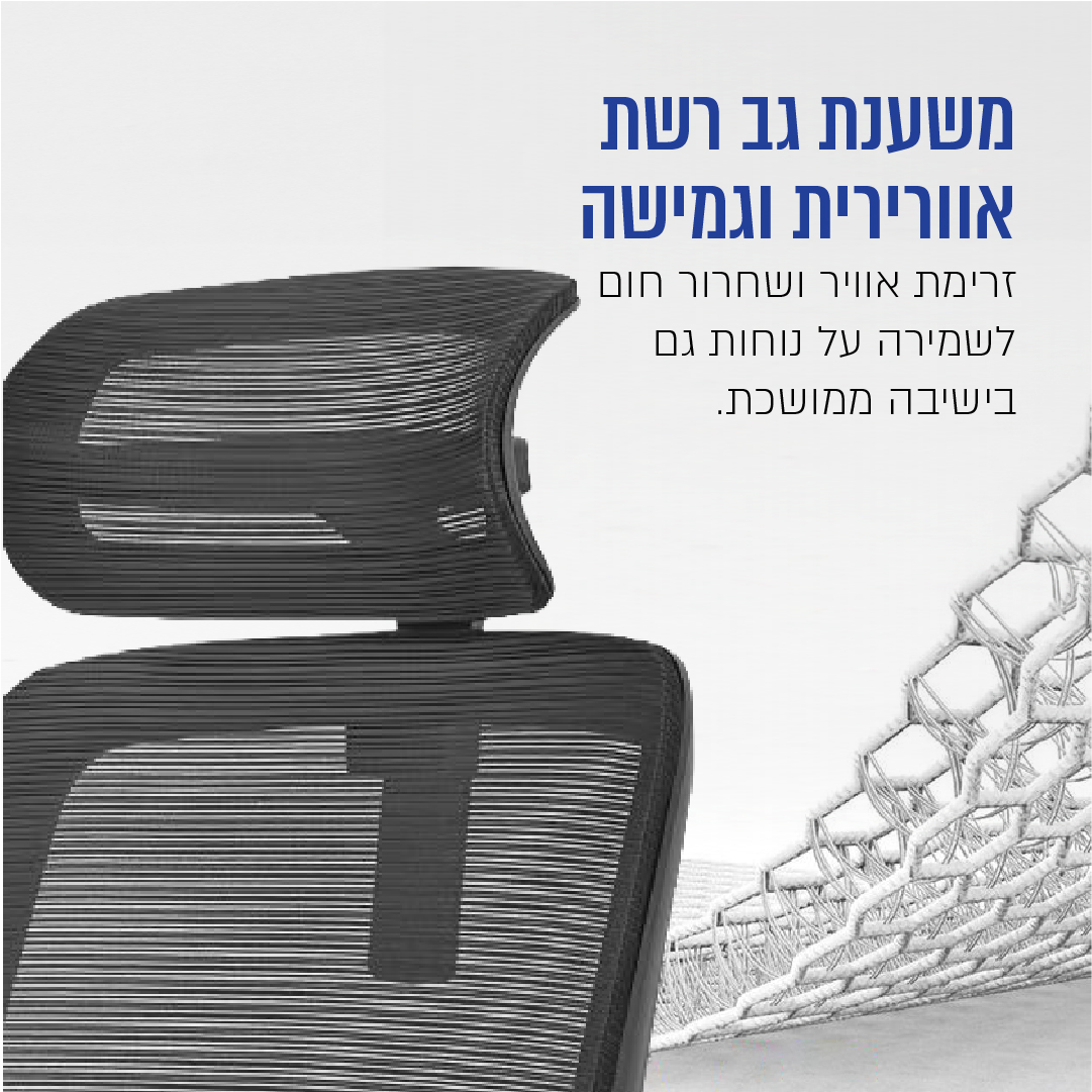 כיסא משרדי אורתופדי גמיש ופנאומטי כולל משענת ראש