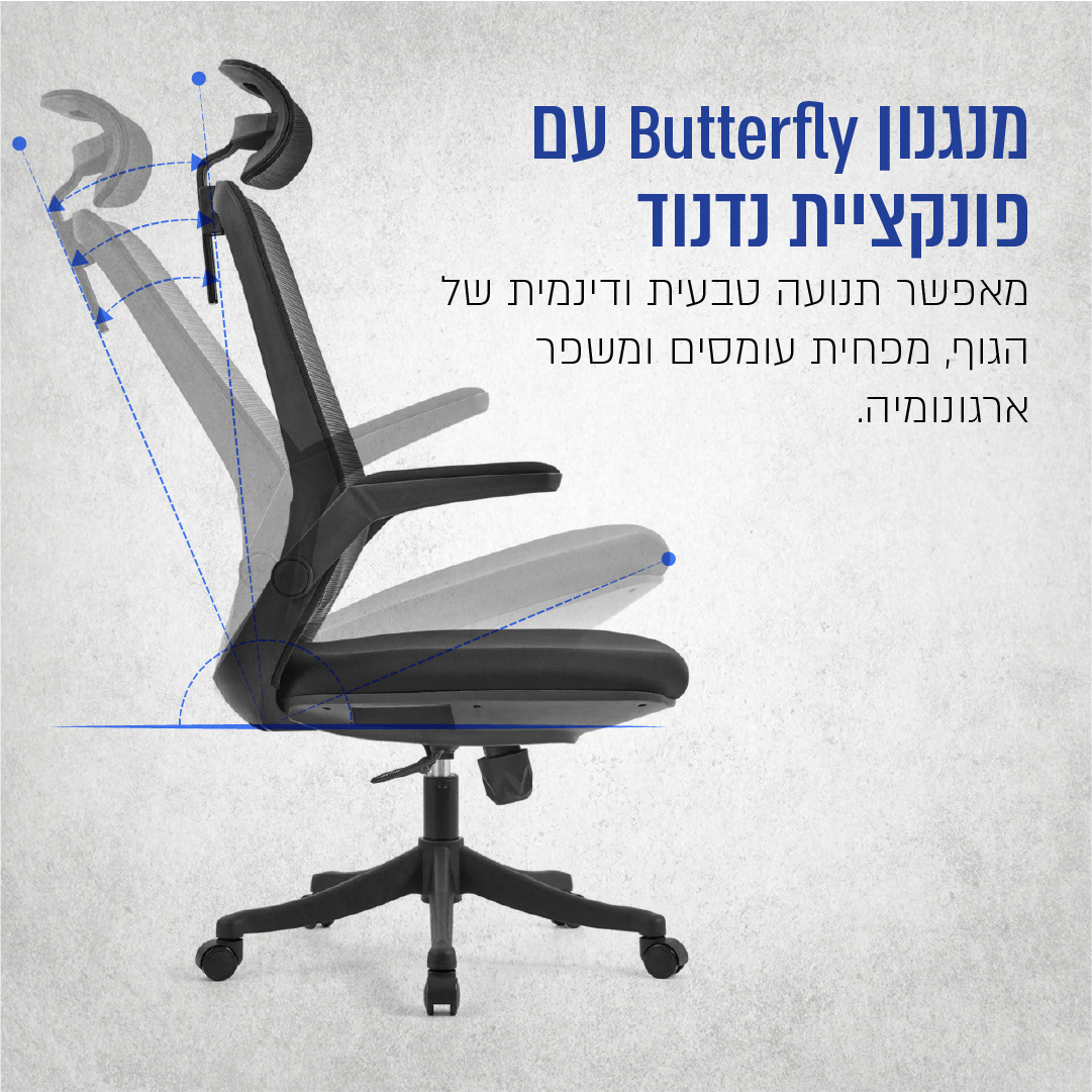 - מנגנון Butterfly עם פונקציית Tilt (נדנוד) – מאפשר תנועה טבעית ונוחה של הגוף