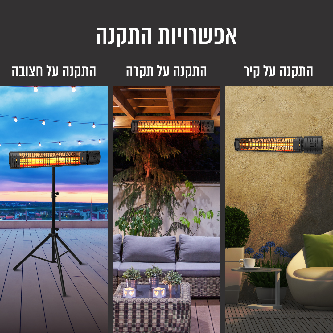• אפשרויות התקנה: מקרן החום מגיע עם מתקן תלייה גמיש המאפשר התקנה על תקרות וקירות וכיוון זווית בהתאמה