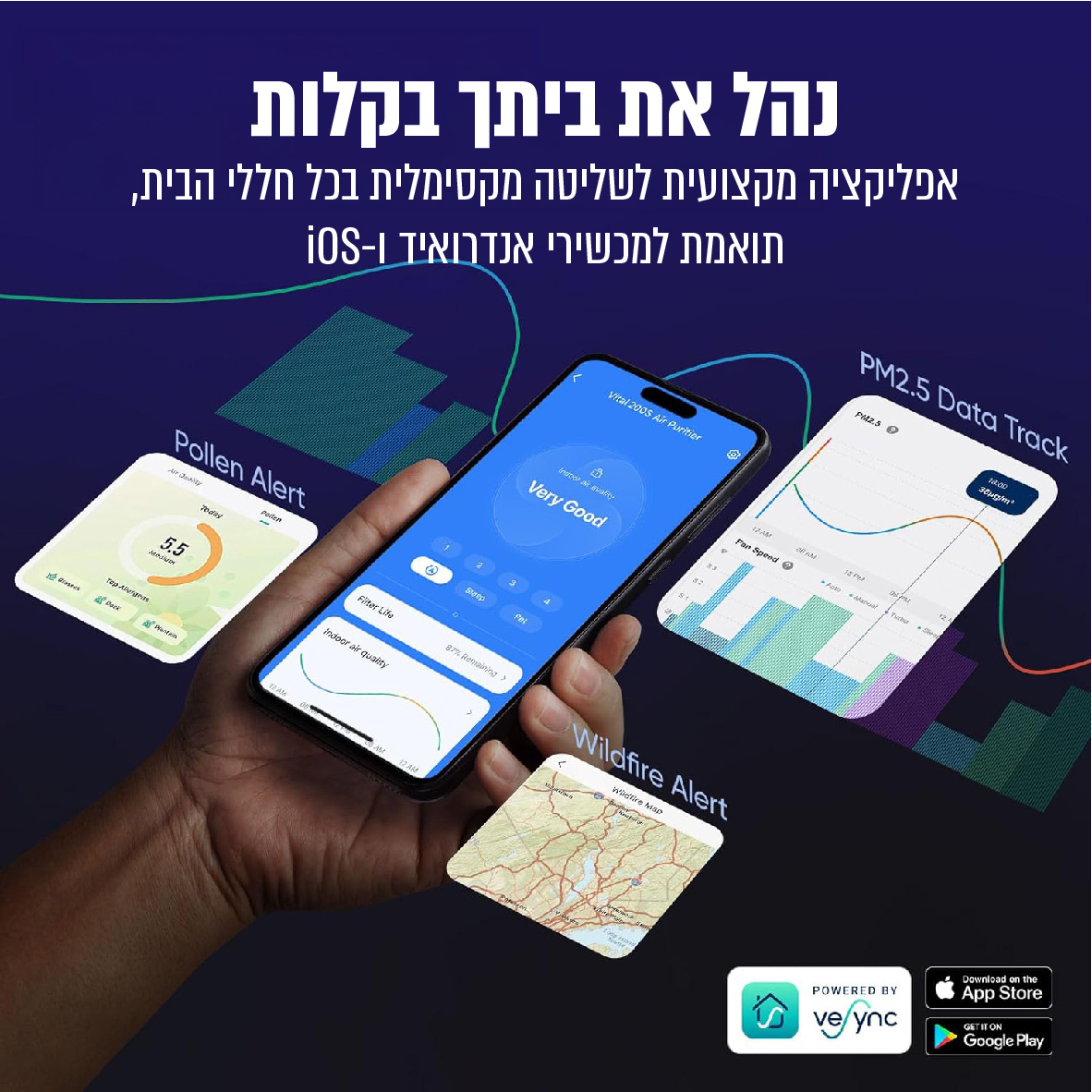- ניתן לשלוט במטהר בקלות דרך אפליקציית VeSync, המאפשרת התאמה אישית של ההגדרות והפעלה חכמה בכל עת