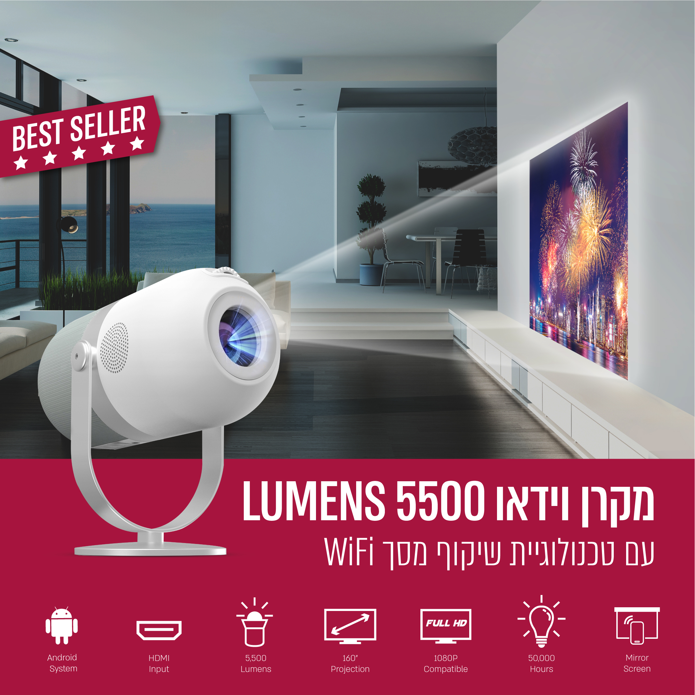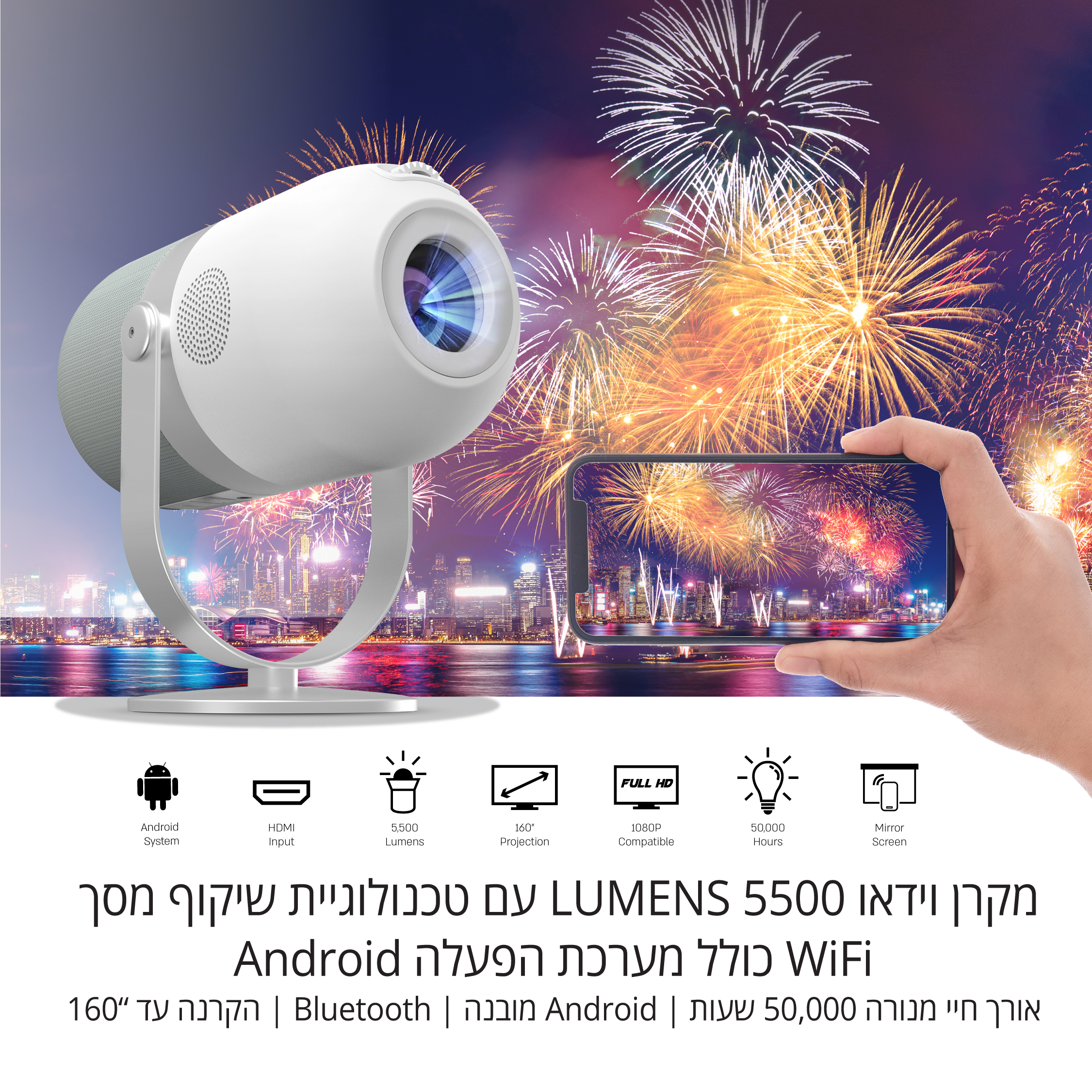 מקרן LED 5500 LUMENS,עם אנדרואיד עד "165, לבן