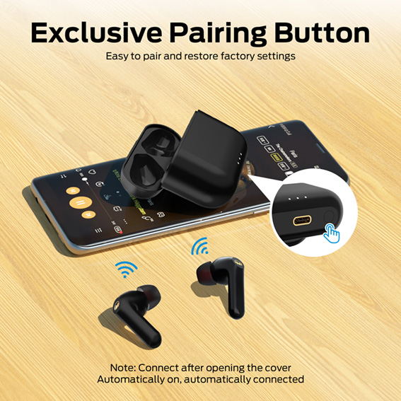 - כפתור Pairing – כפתור ייחודי בתחתית ה CASE למיזוג בין שתי האוזניות ואופציה לסנכרון מלא וחזרה להגדרות יצרן