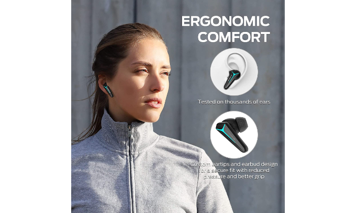 - תאורת LED כחולה -תאורה מיוחדת בעלת עיצוב גיימינג ייחודי לחוויית משחק מושלמת, העברת מצב ע"י 3 לחיצות מהירות על אוזנייה ימין כדי לעבור ממצב מוזיקה למצב גיימינג