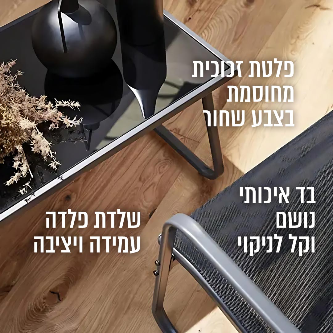 - חומרים: פלטת זכוכית שחורה מחוסמת, שלדת צינורות פלדה, בד איכותי