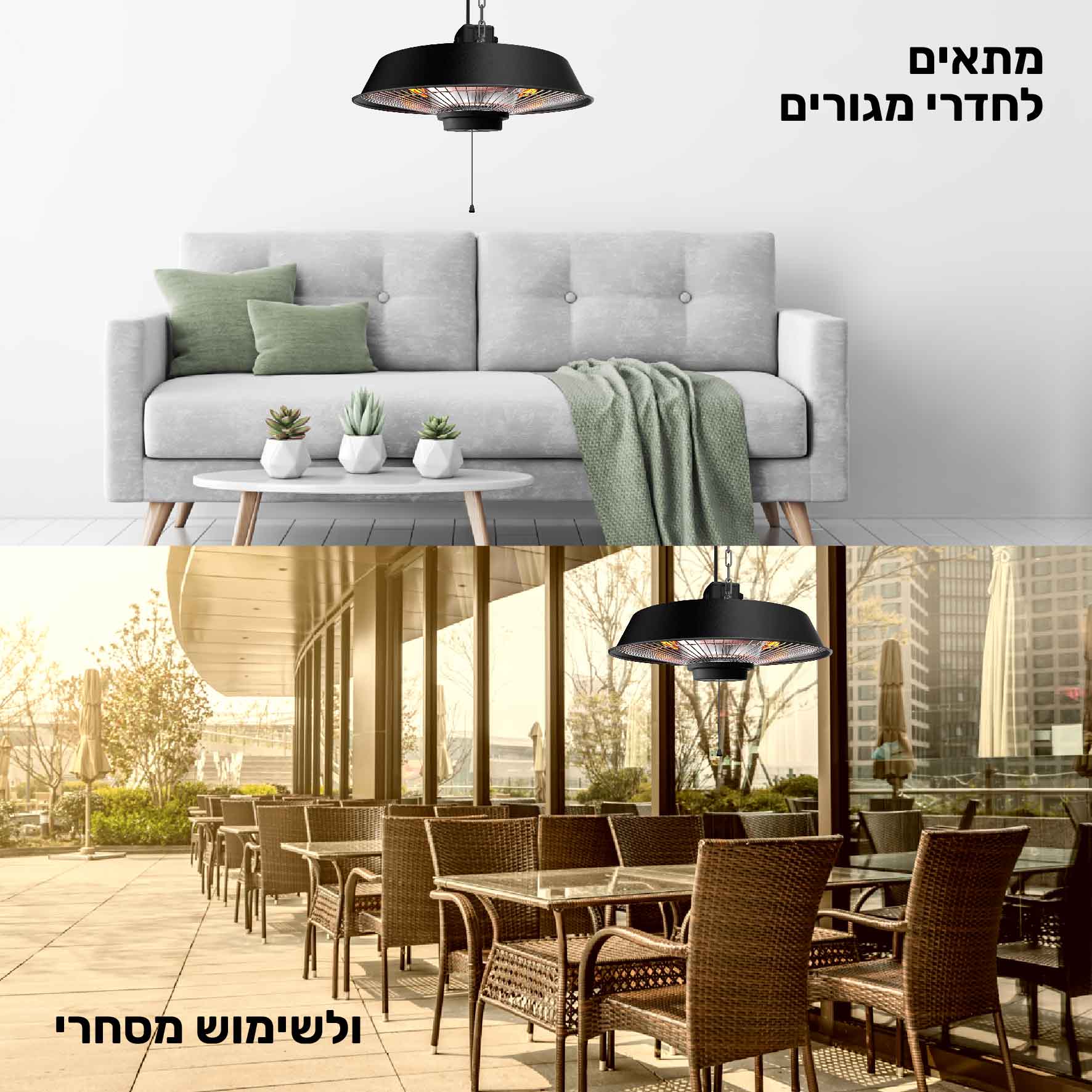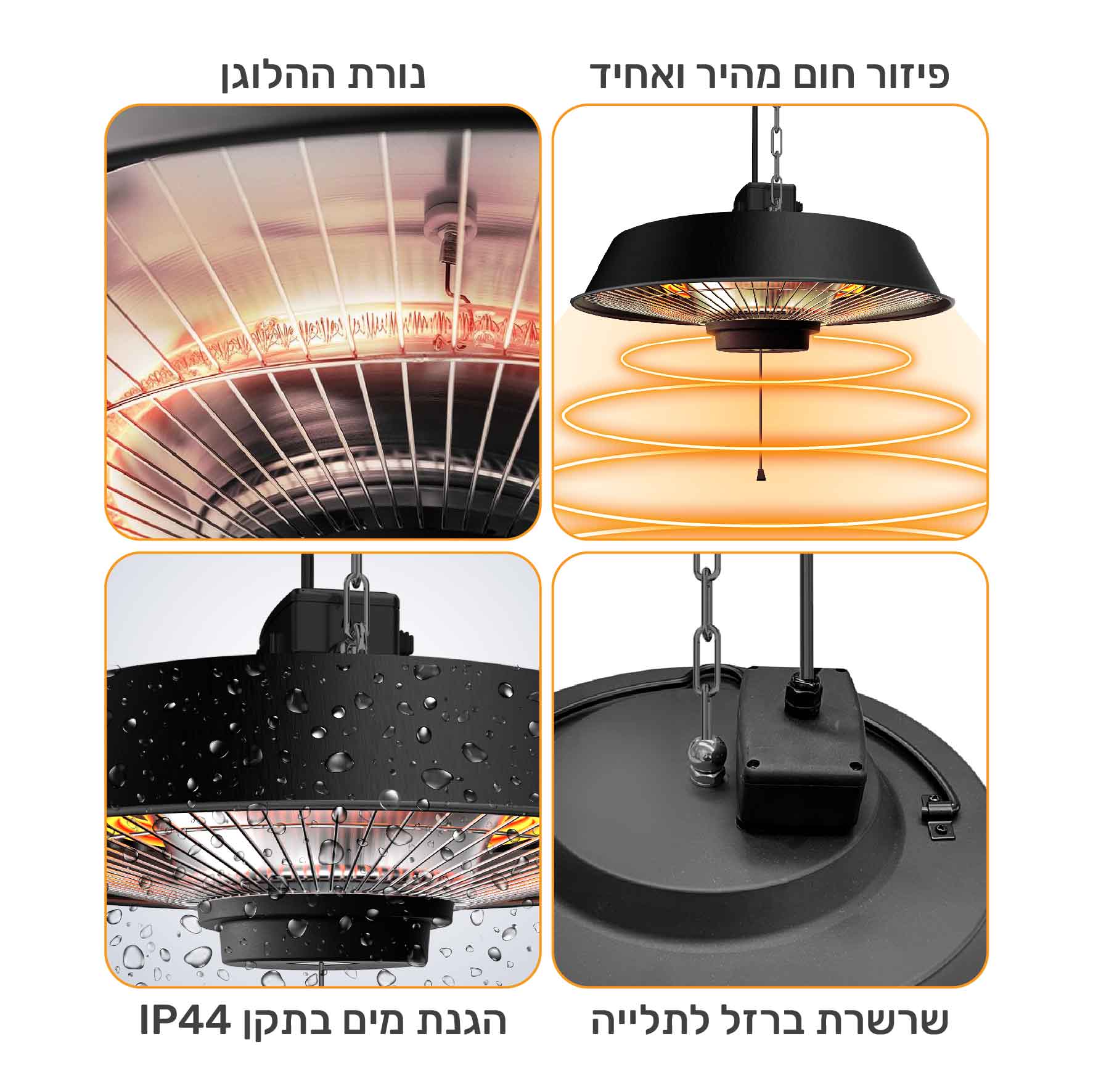 - פיזור חום – תליית הפטרייה ונורת ההלוגן מייצרות פיזור חום בצורה אחידה בחלל רחב להנאת כל הסובבים. שטח חימום -12 מ"ר