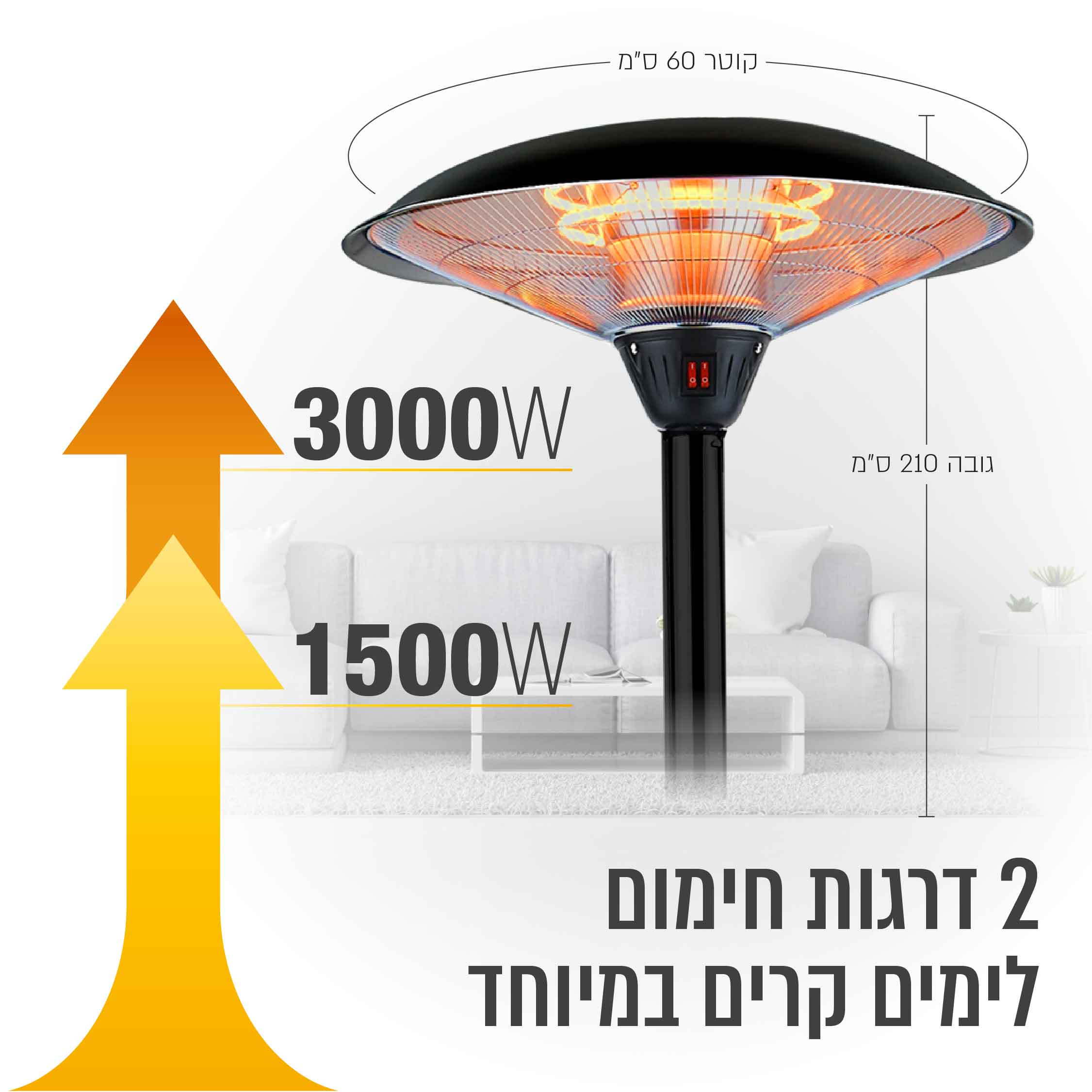 - ויסות חום: 2 דרגות ויסות חום להתאמה אישית 1500W/3000W