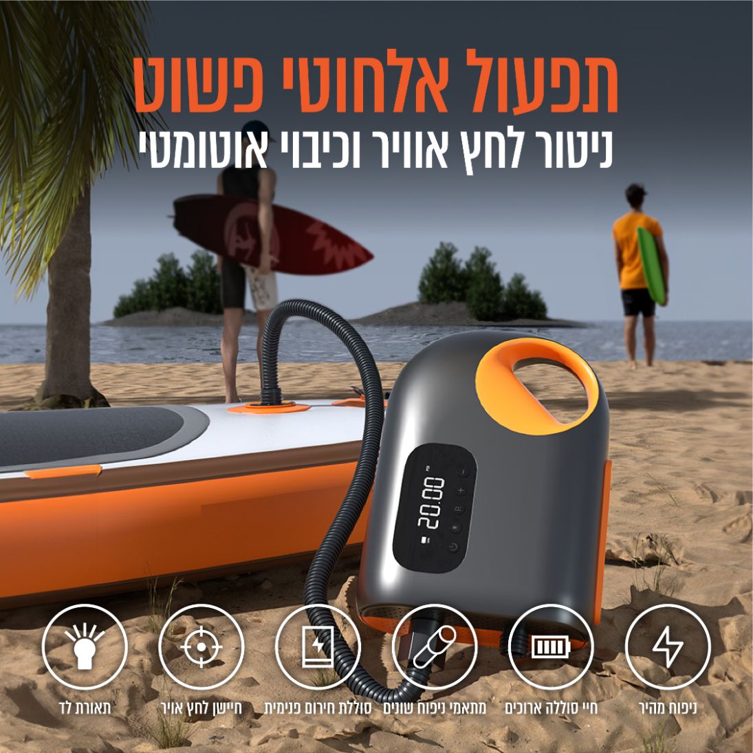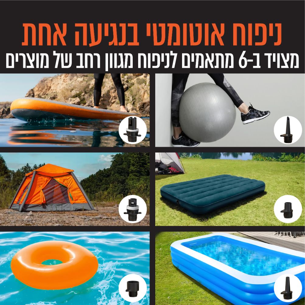 - מגוון רחב של שימושים – מצויד ב-6 מתאמים לניפוח מגוון רחב של מוצרים ממזרני ים, סירות