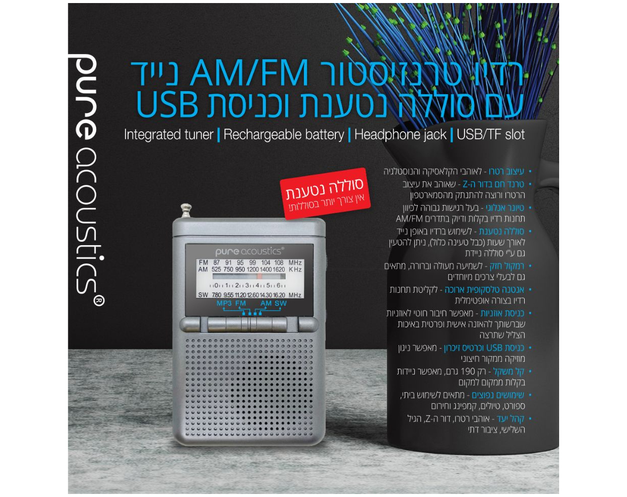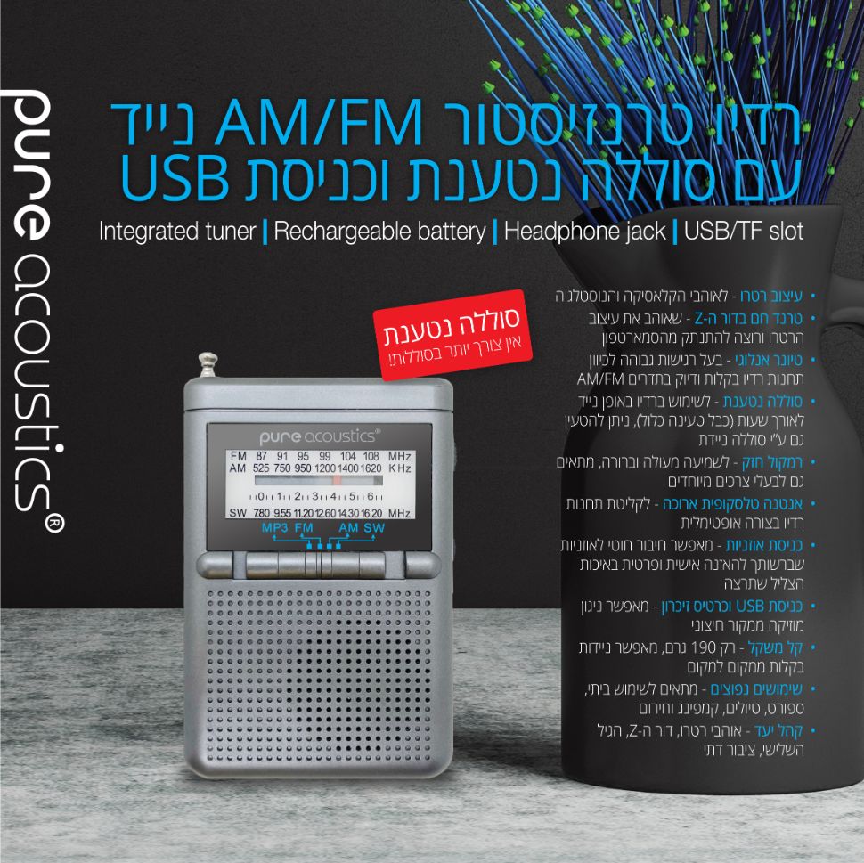 - סוללה נטענת – לשימוש ברדיו באופן נייד לאורך שעות (כבל טעינה כלול), ניתן להטעין גם ע”י סוללה ניידת