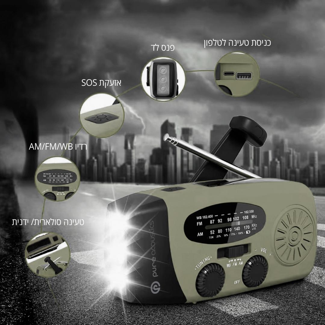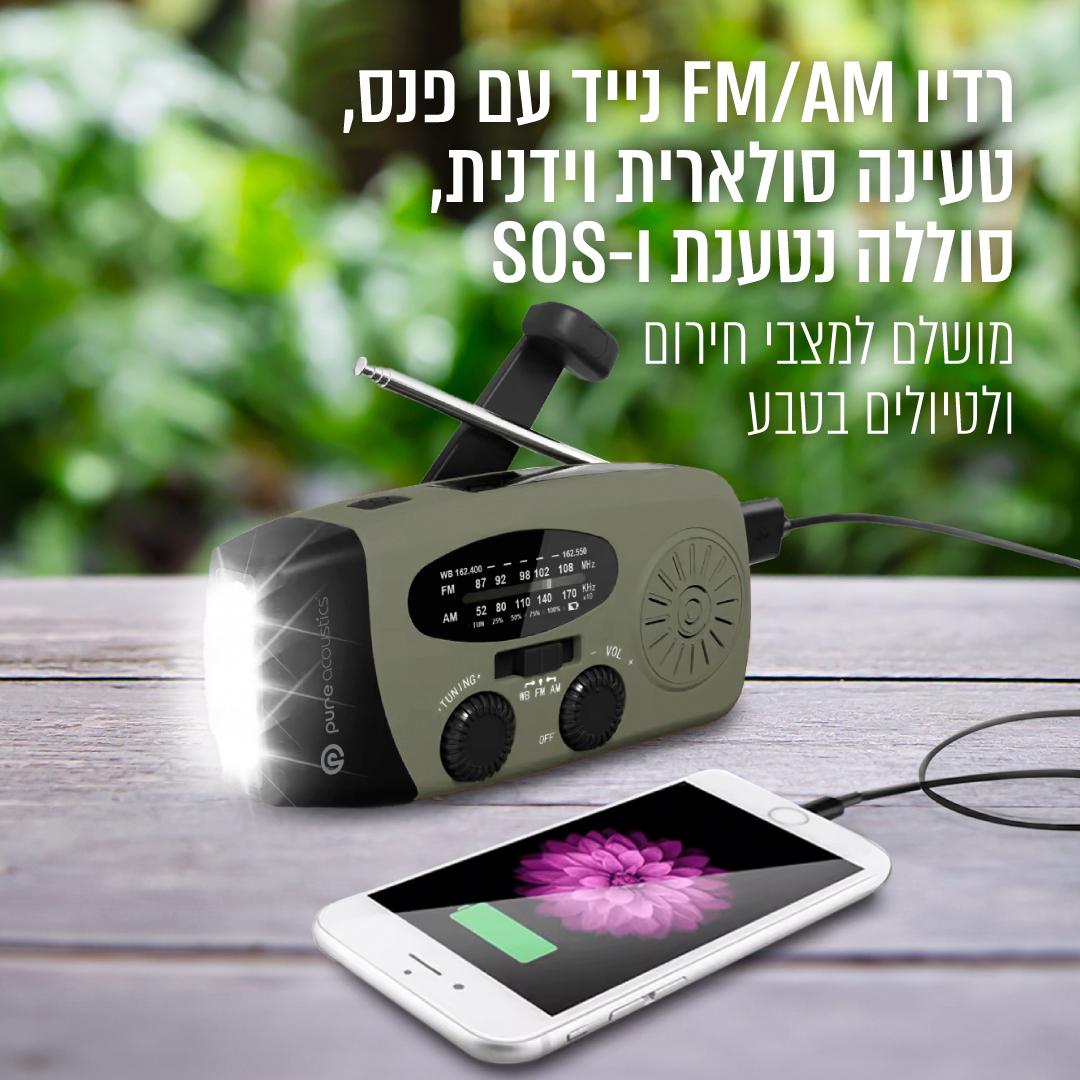 רדיו FM/AM נייד עם פנס, טעינה סולארית וידנית, סוללה נטענת ו-SOS