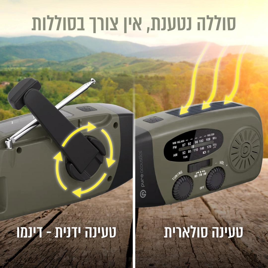 - המספקת זמן שימוש ממושך של עד 8 שעות במצב רדיו ומתאימה להטענה מהירה וקלה באמצעות שמש או דינמו. (ניתן להטעין טלפון נייד)