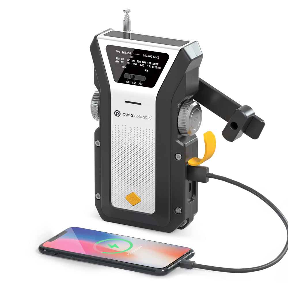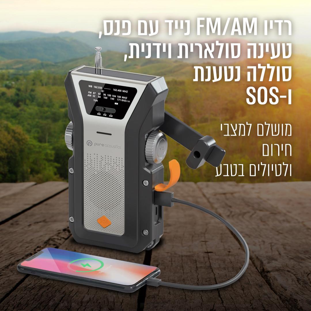 - רדיו FM/AM נייד המשלב פנס חזק, טעינה סולארית וידנית, וסוללה נטענת עוצמתית בנפח 4000mAh