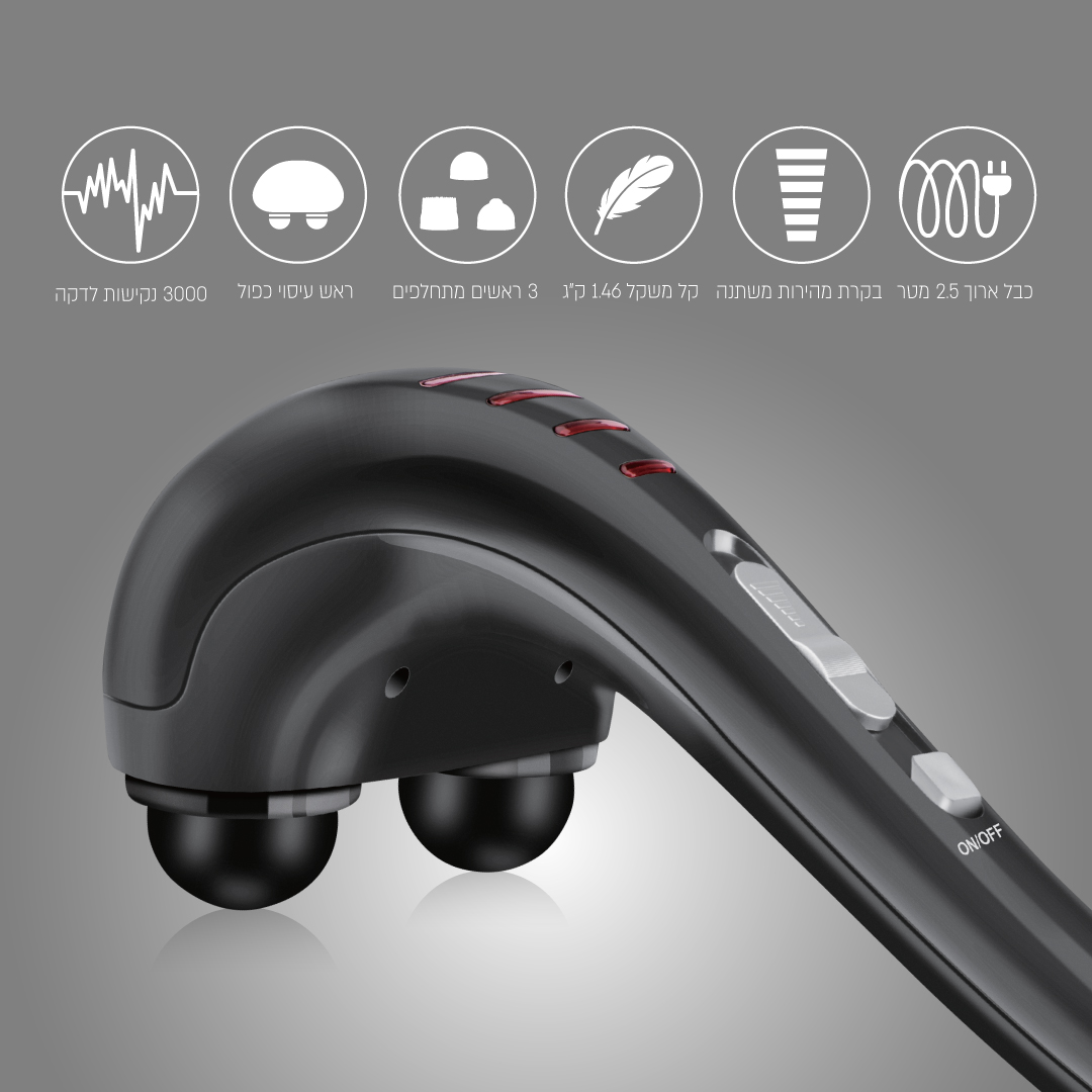 - עוצמתי – מנוע עוצמתי: מנוע המספק עד 3000 נקישות לדקה, מה שיוצר עיסוי עמוק המרגיע ומשחרר את השרירים הכואבים והתפוסים