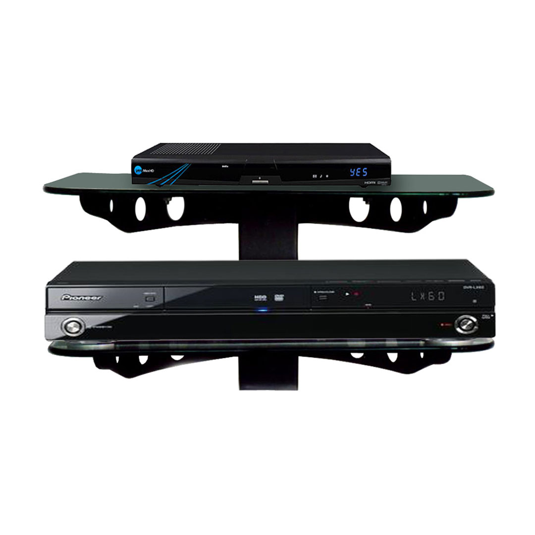- שני מדפים מזכוכית מחוסמות בעובי 6 מ"מ לתליית שני מכשירים כגון ממיר כבלים, סטרימר, מיני מחשב ו/או DVD