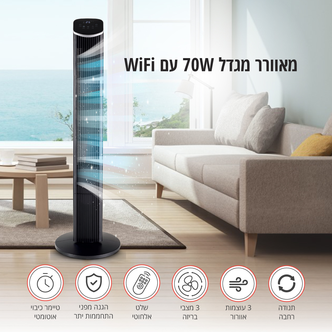 מאוורר מגדל- 46" – 70W עם WiFi ותצוגת LED, שחור